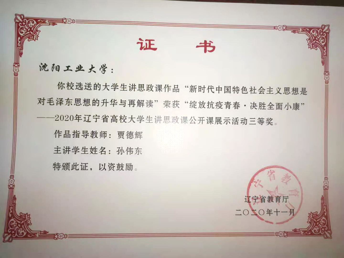 详细 >>近日,在辽宁省教育厅主办的2020年辽宁省高校大学生讲思政课公开课展示活动中,我院教师贾德辉作为指导教师,与主讲学生孙伟东一同设计了大学生讲思政课作品“新时代中国特色社会主义思想是对毛泽东思想的升华...