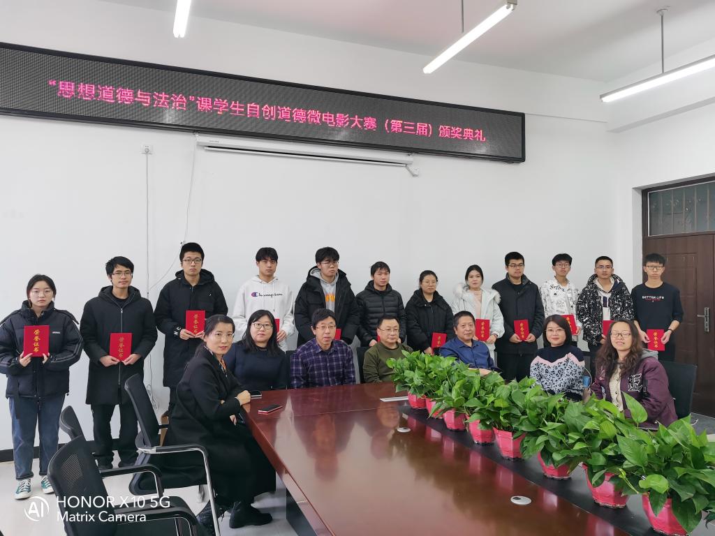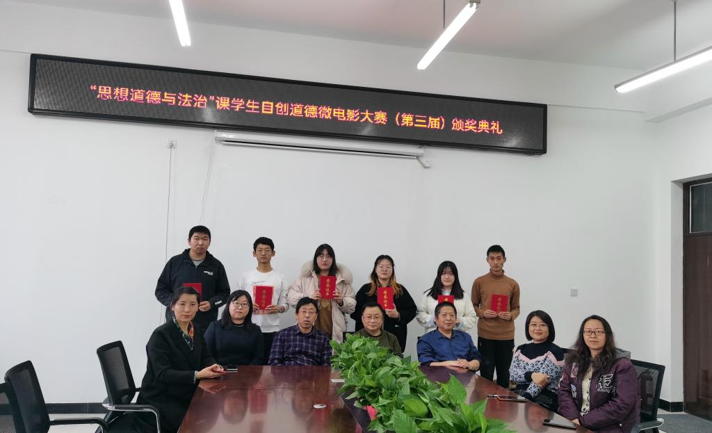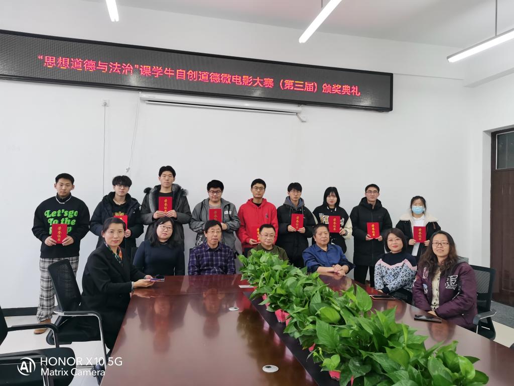 2021年12月9日下午,我院在文科楼124会议室举办了“思想道德与法治”课学生自创道德微电影大赛(2020年级)颁奖典礼,院领导班子成员及学院相关教师出席颁奖典礼并为获奖学生发放证书及礼品。颁奖过后,获得一等奖的代表围绕着电影选材、剧本创作、演员表演力、细节渲染及最后价值观念的输出,分享自己的拍摄感想和心得。