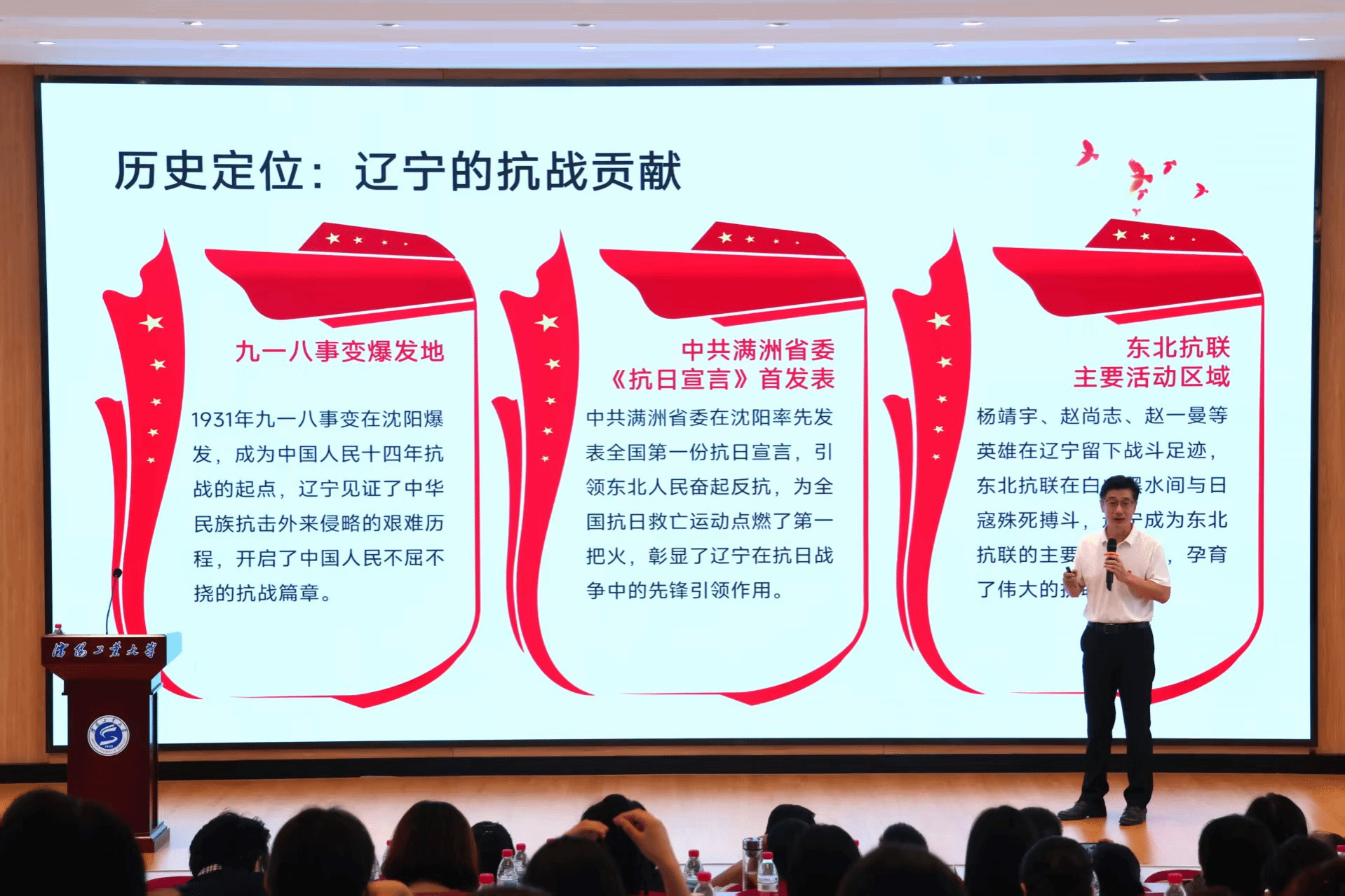 曲弋从辽宁作为“抗日战争起始地”的历史地位讲起,回顾了九一八事变、中共满洲省委抗日宣言、东北人民抗日义勇军英勇斗争等重大历史事件,深刻阐释了抗战精神中的爱国情怀、民族气节、英雄气概与必胜信念内涵。讲座重点聚焦“抗战精神”与“工匠精神”的内在联系与时代传承,从理论上较为系统阐述了“抗战精神”与“工匠精神”的逻辑纽带与精神接力密码——在抗日战场上,先烈们以生命捍卫尊严,今日工大人则以数十年如一日的专注,将爱国热忱注入大国重器的制造,实现从“保家卫国”到“产业报国”的精神升华;抗日英雄们以血肉之躯抵抗侵略者,工大人以“中国制造”打破国外技术垄断,用“中国标准”重塑民族工业尊严;“工匠精神”就是新时代的“英雄气概”,大国工匠就是新时代的民族英雄;当代大学生应以“百折不挠、坚忍不拔的必胜信念”,在“强国建设、民族复兴伟业”中“展示才华、大显身手”,以中国式现代化推进民族振兴。