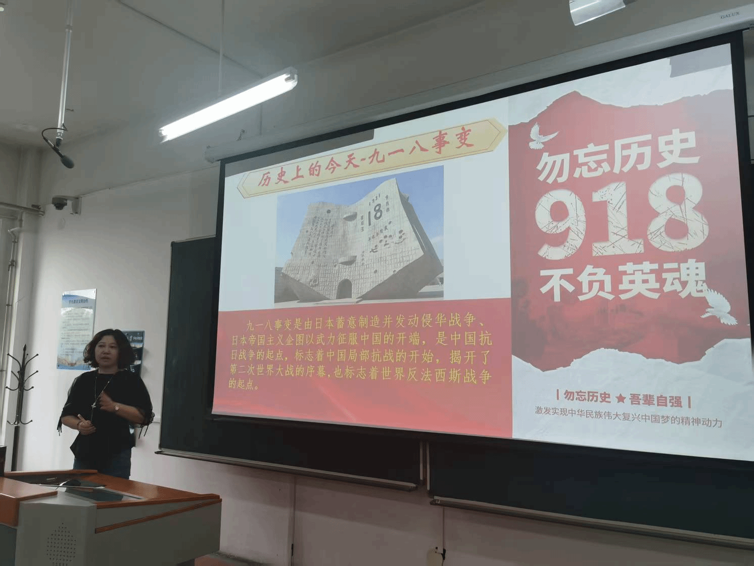 “九·一八”事变当日,教师们精心准备,通过播放纪录片、讲述东北抗日联军英烈的战斗事迹等形式,带领学生重温“九·一八”事变后山河破碎的苦难历史,让学生重温历史,勿忘国耻,以实际行动传承和弘扬抗战精神。