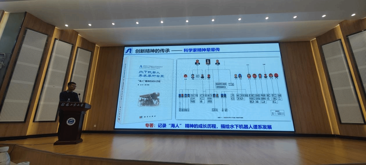 作为我国深海技术领域的标志性成果,“海斗一号”首次在国际上完成对马里亚纳海沟挑战者深渊西部凹陷区的大范围、全覆盖声学巡航探测,并突破性地实现无缆无人潜水器自主模式万米坐底,连续获取高清视频影像资料,填补了全球深海探测的技术空白。这一里程碑式的成就,标志着我国在全海深无人装备领域成功跻身世界海洋科技前沿。唐元贵在报告中深情回顾了在老一代科学家精神感召下,带领团队十年磨一剑,将“海斗一号”从图纸变为现实的不凡征程。他特别阐释了从求学期间“自强笃行”的工大校训精神到投身科研工作中“求真务实、甘于奉献、凝心聚力、敢为人先”的“海人”精神对自己成长发展的深刻影响,以及将这份信念融入海洋强国建设的赤子情怀,深深感染了在场每一位听众。